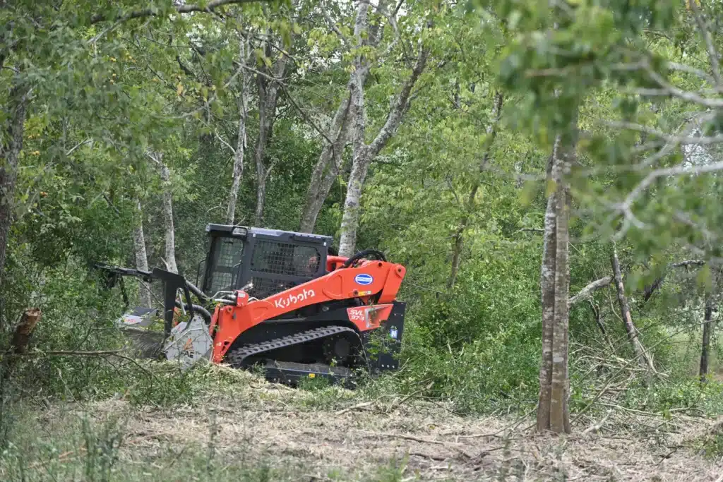 Equipment note: We use a skid‑steer mulcher and matching attachments to work efficiently and precisely, minimizing disruption to soil and root systems.